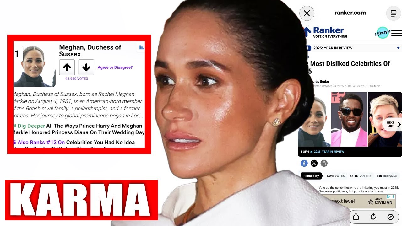 In a devastating blow that’s sent shockwaves through Hollywood and beyond, Meghan Markle has been crowned the most disliked celebrity of 2025 for the fourth consecutive year, according to Ranker.com’s explosive user-voted poll released on October 23. The Duchess of Sussex racked up a whopping 48,000 votes to claim the top spot, edging out scandal-plagued rapper Sean “Diddy” Combs in second, while her husband Prince Harry trailed close behind in third. Insiders reveal the Montecito mansion has turned into a war zone, with Meghan allegedly throwing full-blown tantrums β screaming at staff, smashing phones, and locking herself away in tears as the “Queen of Hate” title crushes her comeback dreams.